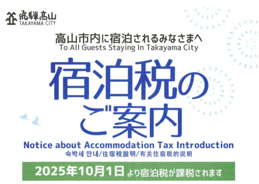 2025年10月1日より、ご宿泊のお客様を対象に、宿泊料金とは別に宿泊税をお支払いいただきます。